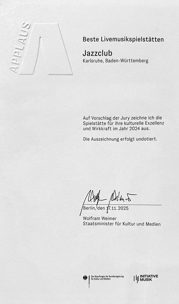 17.11.2025: Ausgezeichnet: Der Jazzclub Karlsruhe erhält den diesjährigen APPLAUS Award!